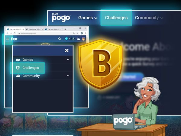 We know the new Pogo brings many changes, including how you access Challenges. The new Pogo is responsive – meaning the site automatically adjusts to fit the space available in your browser window. On larger browser windows or device screens, you can simply click “Challenges” in the top navigation to access Challenge Central.