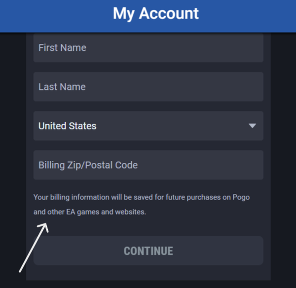"WHEN DELETED MY CREDIT CARD INFORMATION THERE IS A STATEMENT FROM EA THAT "YOUR BILLING INFORMATION WILL BE SAVED FOR FUTURE PURCHASES ON POGO AND OTHER EA GAMES AND WEBSITES"