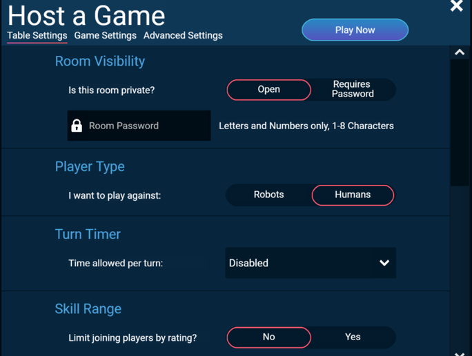 - After selecting your preferences, select Play Now to start a table!
