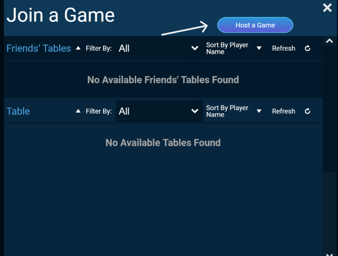 You will have the opportunity to view all the available tables that are awaiting players to join or create a table by selecting Host a Game.