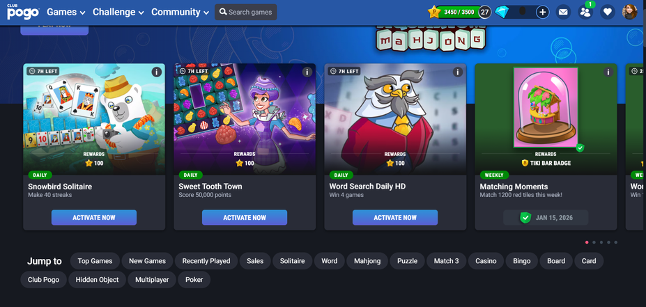 Hello! Sorry to hear you are not able to see the daily challenges. Because Pogo is a browser-based gaming site it is imperative for us to keep our devices clean, updated and have room to move.
