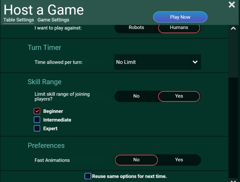 You will find a variety of Table Settings and Game Settings to establish before anyone joins your table, including setting the Skill Range of joining players!