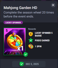 Thank you for the information. With the Mahjong Garden "Complete the Season Wheel 20 times", to complete the season we must match (in any order):