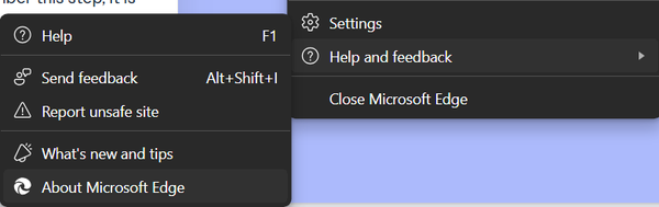 Once you have logged out of Pogo, open the homepage for your device - in the top right corner and you will see three dots next to the profile image, click on this and a dropdown box will appear - towards the bottom you will see Help and Feedback click on this and then select About Microsoft Edge as seen in the picture below.