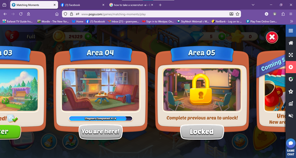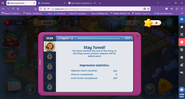 Matching Moments re-set. Because of the chapter re-set but not the levels I am now stuck with no more star levels, unable to move onto the next chapter which is available, I bought the gold ticket and unable to see decorations awarded. I have tried cache clean outs etc but no change. The only solution I can think of is to reset both the chapters and levels to the beginning and start again, I am prepared to lose coins and powerups won just to be able to play this game. See screen shots. regards Aussie Deb.