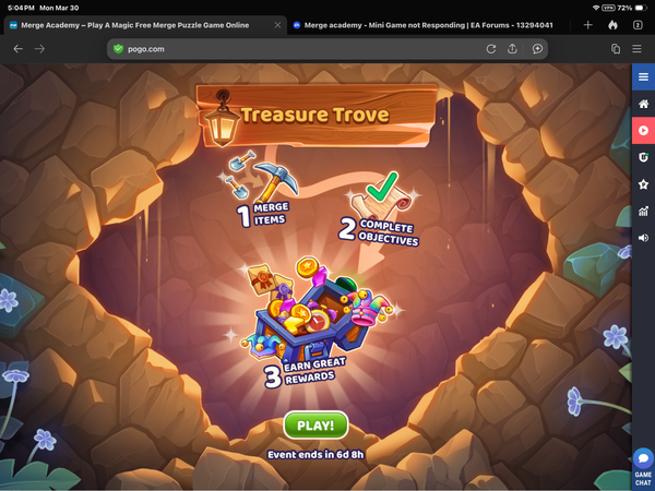 On top of all this, today I have not been able to play all day. The game opens up to Treasure Trove and a play button. The PLAY button does not work and the screen is frozen. So now, I am missing out on my daily bonuses and not being able to play today and get more energy coins and sales. My son plays a similar game on a different platform and now I’m thinking about getting off POGO when my paid subscription expires. This is kinda ridiculous. There is no way to chat with a human and get any answers to the many problems with Pogo.on a positive note, I love the Treasure Trove, Dessert and Seashell games you’ve added to Merge Academy. It makes the game more enjoyable and more ways to play and earn. It would be nice if you did it more often.