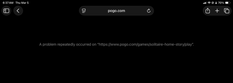If your error looks like the example below, in white or black mode: "A problem repeatedly occurred on https://www.pogo.com/games/...'" this is a generic Apple WebKit error. It appears when Safari’s WebKit engine, which powers all browsers on iPhone and iPad (and Safari on Mac), stops loading the page. This message is generated by WebKit, not by Pogo.