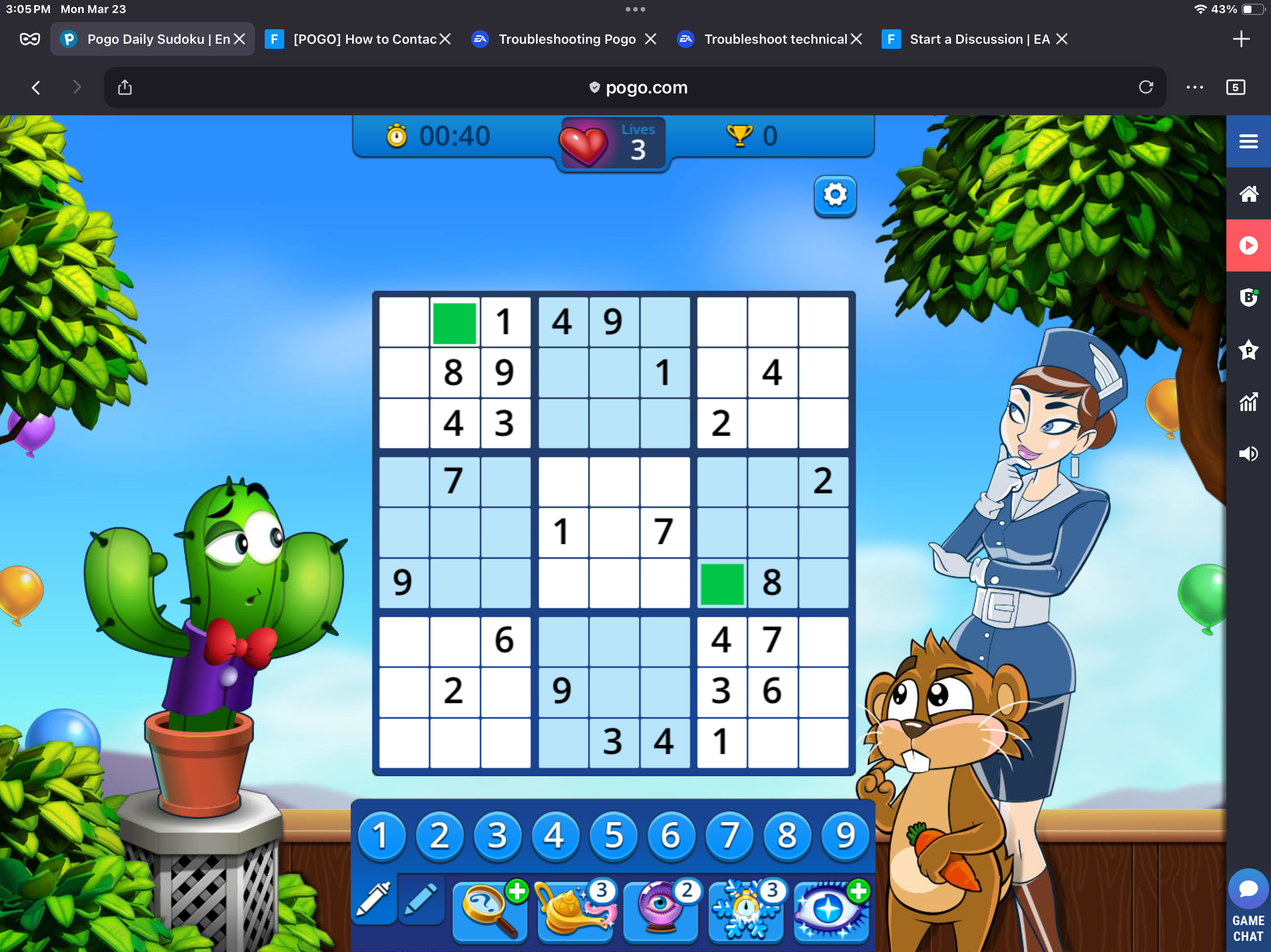 It will not allow me to select a space in the puzzle nor select a number. It makes a sound when choosing either, but nothing happens. All other games such as canasta, and jungle work fine. I play on an iPad Pro. AND why is there not a direct way to contact support when paying to play?? Or in this instance paying and not being able to play?