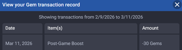 I have missing gems, and when I checked gems transaction history it said Post-Game Boost on March 6th, I did not buy anything with gems . Does somebody know what Post-Game Boost is? I searched already and found no answer, contacting Pogo was not possible. tia