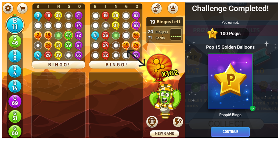"Poppit Bingo - Does not credit for golden ballon’s popped": You will need to use a powerup to turn the ballon golden, it is the solid gold, not the one with the circle around it as seen below.