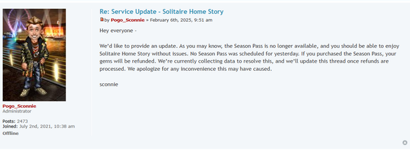 "We’d like to provide an update. As you may know, the Season Pass is no longer available, and you should be able to enjoy Solitaire Home Story without issues. No Season Pass was scheduled for yesterday. If you purchased the Season Pass, your gems will be refunded. We’re currently collecting data to resolve this, and we’ll update this thread once refunds are processed. We apologize for any inconvenience this may have caused."
