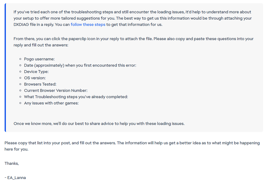 Why? "The information requested helps pinpoint the issue with precision, instead of guessing across dozens of possible combinations. When this info is missing, it slows everything down, for the team and players waiting for help."