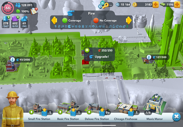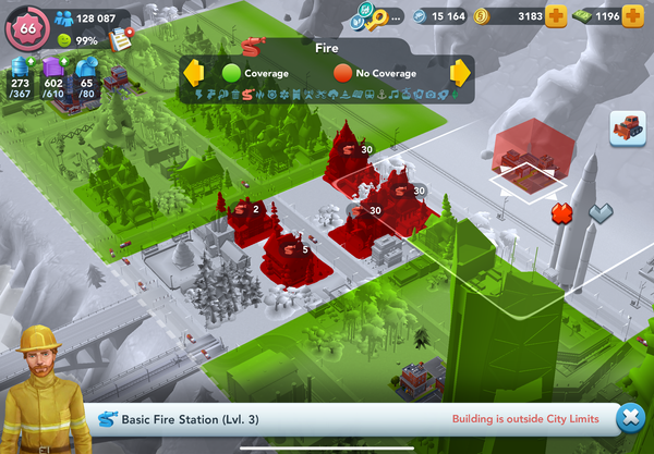 To avoid “insufficient” coverage (unhappy faces) the fire station had to be upgraded from 250 to 350. Thus total capacity 2850 was needed to cover demand 472.