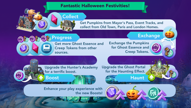 Receive Ghost Essence by converting Pumpkins and gather more from progressing through the Mayor’s Pass and Event Tracks, as well as completing City Album Collections.