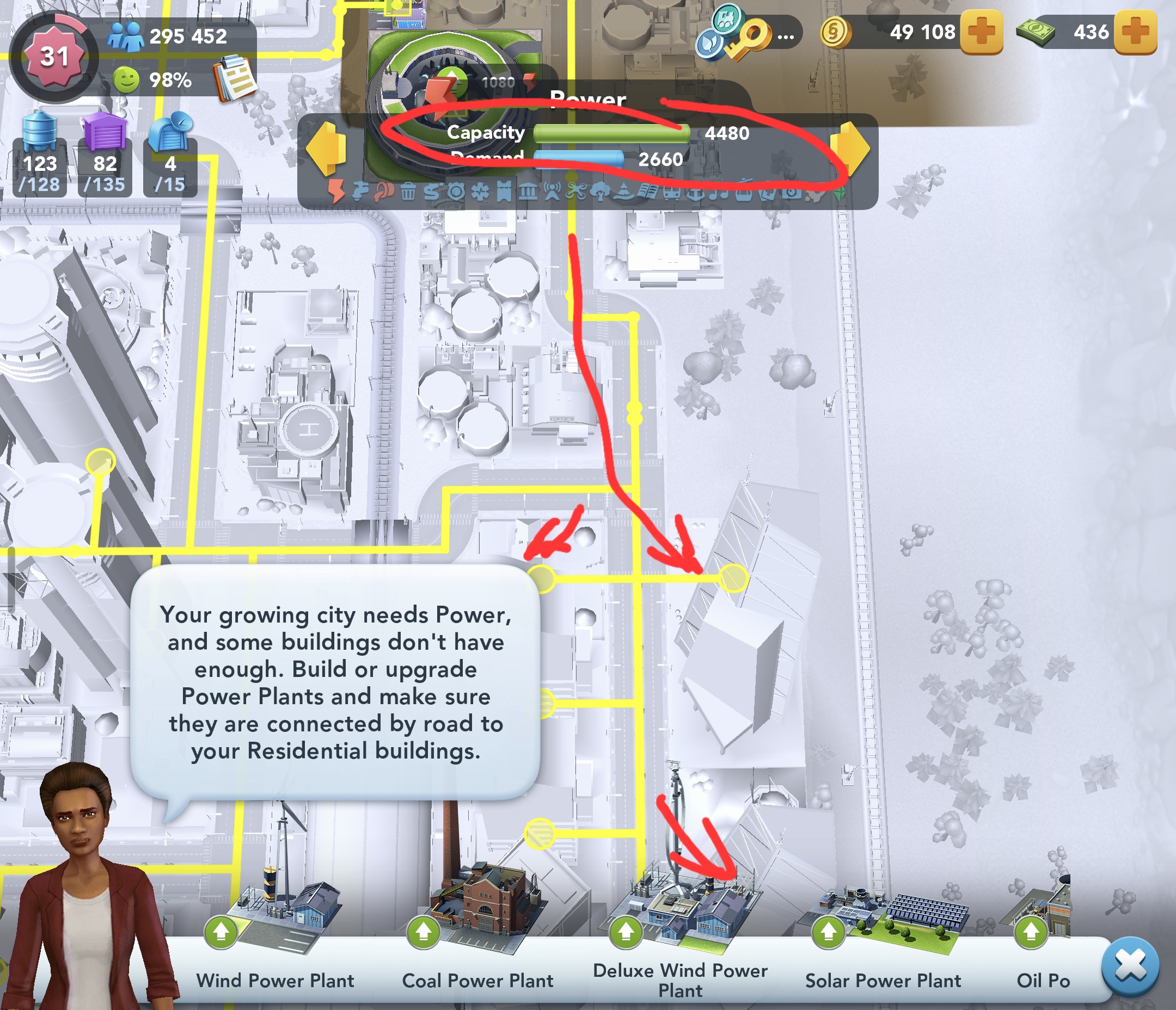I have exactly the same problrm with power. All roads are connected, production level is higher than demand but still few buildings don't get enough power and cannot be upgraded. Happiness level drops.