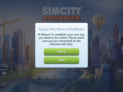 I have deleted and then downloaded Simcity Buildit application. In the past this worked nicely to remove any issues. This time after downloading the game, I get only a window informing me I have to be online. (see below)