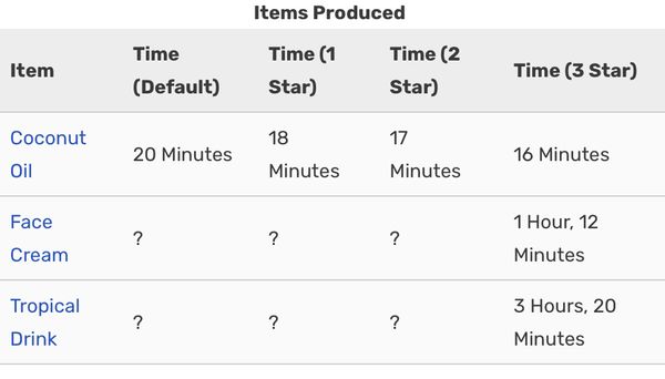d6yrb92yiuyc​ Here is a chart of production times for the Tropical Products Store located in Sunny Isles. How do your 3 star (fully upgraded) production times differ from this chart?