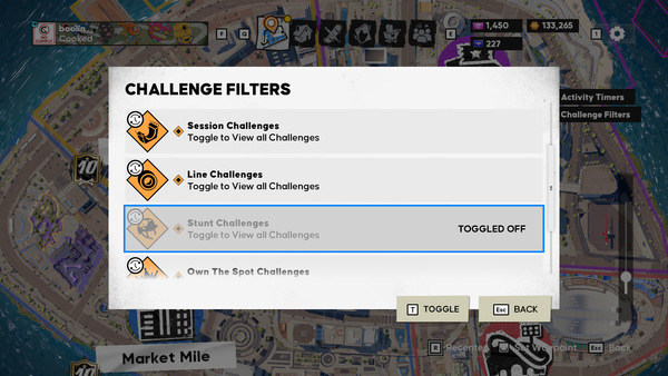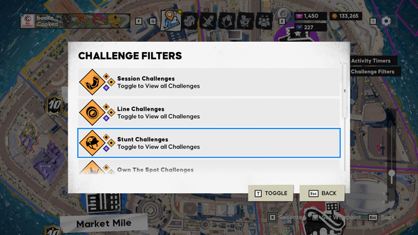Each challenge can be toggled individually. Crew: Session, Line, Stunt, Own The Spot, City: Session, Line, Stunt, Own The Spot, Seasonal: Session, Line, Stunt, Own The Spot & Own The Lot.