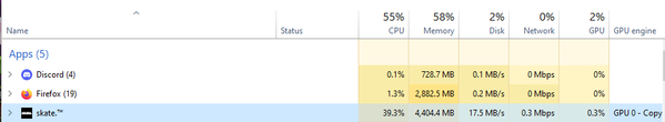 My system has an RTX 2080 and no integrated graphics. I have a Ryzen 5 2600 as my CPU and 32GB RAM. For whatever reason, the last few times I've played the game the FPS has been at around 20. Checking task manager, the Skate. program is always at 0% utilisation for my GPU, with a high of 0.1%.