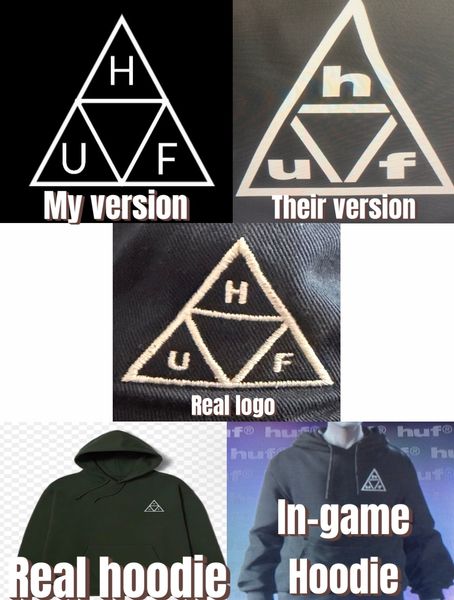 You (correctly) referenced the old 'triple triangle' icon, which featured a thin uppercase font. Notwithstanding, HUF Worldwide has since changed their font to a bold lowercase. And, where the HUF triple triangle icon was previously an equilateral triangle, it is now an isosceles triangle. So, HUF has changed both the font and triangle in recent years. Thus, naturally, EA added HUF's most recent icon to Skate.