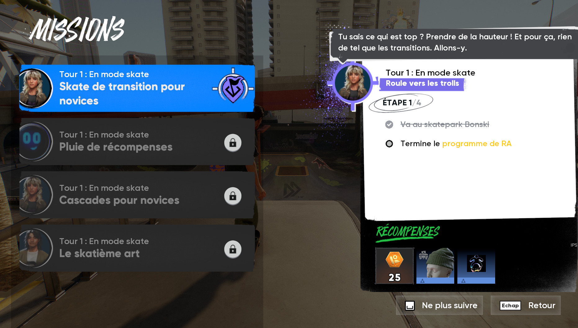Je viens ici pour obtenir de l'aide car je suis bloquer sur le mission "Tour 1: En mode skate