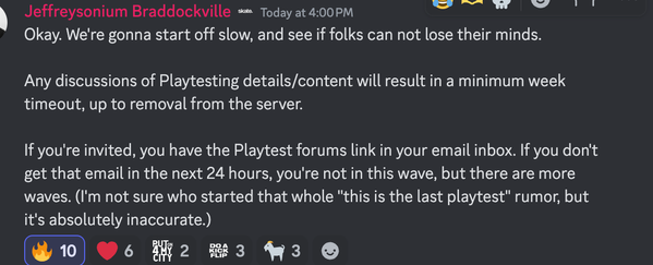 Also, depending on how serious the take the NDA, everyone posting about getting or not getting codes will likely not be receiving one. They explicitly state the only information you're allowed to reveal outside of the official playtesting forums is that you've signed up.