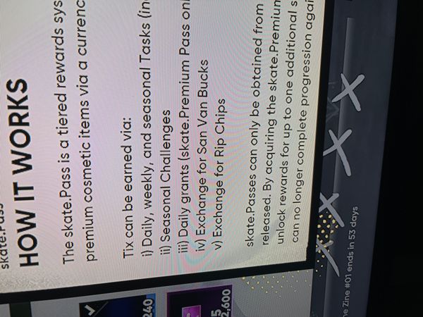 I knew ea wanted money and like to trick players but just downright lying that you can get tix with rip chips is just wrong. They clearly want you to buy them with san van bucks. Also the challenges on the map that you earn tix from should refresh daily. How do you expect players to finish the skate pass and complete there seasonal tasks without refreshing the tix challenges daily.