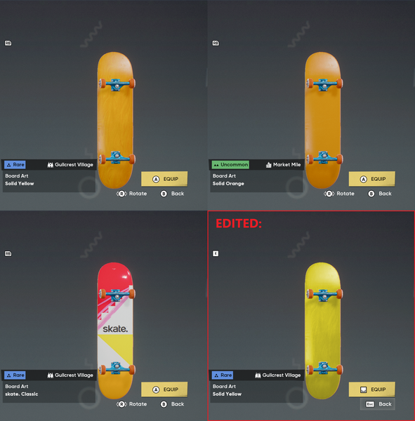 The Solid Yellow Deck just looks like the Solid Orange Deck. The only difference is that the Solid Yellow has a wood grain texture that is barely visible. The skate. Classic Deck has better distinction between orange and yellow colors on the board. Just take the yellow from that design and apply it to the Solid Yellow Deck.