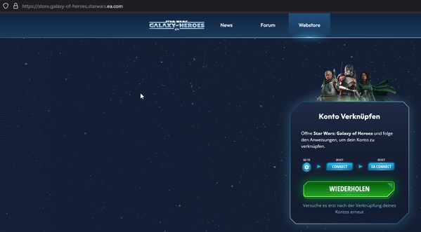 Einleitung: Star Wars: Galaxy of Heroes - Kesselflug-Belohnung kann nicht abgeholt werden, da Konto nicht mit EA-Webstore verknüpft werden kann. Ich glaube nicht, dass es an der Belohnung selbst liegt, sondern eher an der Funktion mein Konto zu verknüpfen.