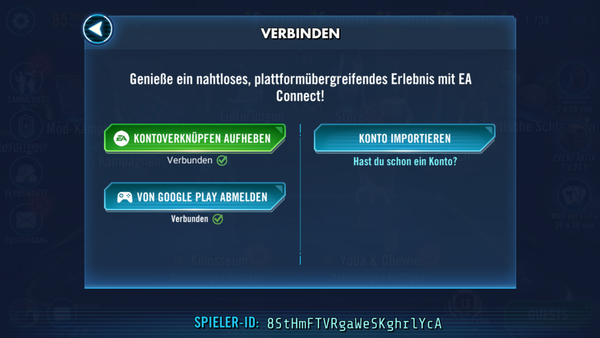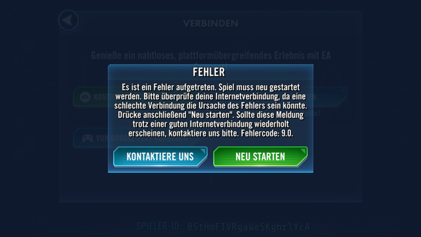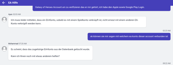 Ich habe einen Star Wars Galaxy of Heroes Account der mit meine Ea-Konto verbunden ist welches ich vor 2 Jahren selbst gelöscht habe. Da ich gerne auf dem Pc spielen und den Webstore benutzten möchte, muss mein Account mit einem funktionierenden Ea-Konto verbunden sein. Im Spiel selbst wird mir angezeigt das ein Ea-Konto verknüpft ist (Verknüpfungen.png). Wenn ich versuche dieses nicht existierende Konto zu trennen bekomme ich eine Fehlermeldung (Fehlermeldung.png). Nach unzähligen Kontaktaufnahmen mit den Supportbots von Ea, als auch mit der Support direkt im Spiel, weiß ich jetzt das tatsächlich kein EA-Konto verbunden ist (Support Nachricht.png) auch wird mir wenn ich per PC-Client mit eine anderen Star Wars Galaxy of Heroes Account meinen Account anschaue kein EA-Id angezeigt (Keine Ea-Id.png).