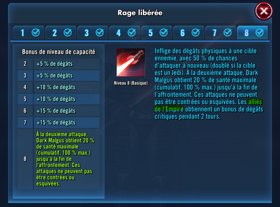 Quant aux imprécisions elles sont plus nombreuses que les erreurs, il y a par exemple les talents de Darth Malgus qui impliquent des "Sith de l'Empire" alors qu'il s'agit plutôt des "alliés de l'Empire Sith", certes la formulation est plus lourde mais nécessaire sinon c'est parfaitement incohérent.