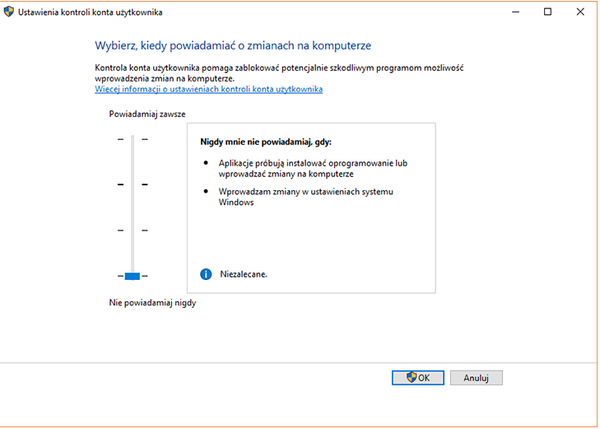 1. Aby upewnić się, że gra nie jest blokowana przez system operacyjny, wyłącz tymczasowo "Kontrolę konta użytkownika" (UAC). Na komputerze, w polu wyszukiwania wpisz wyrażenie kontrola konta użytkownika, a następnie naciśnij lub kliknij pozycję Zmień ustawienia kontroli konta użytkownika. Przesuń suwak na sam dół, zachowaj zmiany i ponownie uruchom PC.