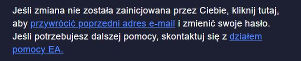 Niestety poprzez forum nie będziemy w stanie pomóc w kwestiach związanych z kontem EA. Zwróć jednak uwagę na informacje zawarte w wiadomości , otrzymanej po zmianie danych konta: