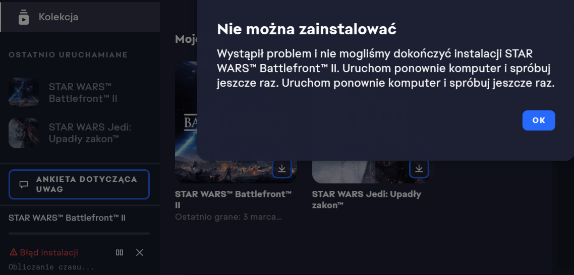 Hej, miałem xbox gamepass na miesiąc, więc zainstalowałem SW Battlefront II (razem z aplikacją EA), po wygaśnięciu xbox gamepass'a, gra automatycznie zniknęła z mojego dysku, załatwiłem sobie nowy xbox gamepass, i chciałem zainstalować na nowo SW Battlefront II, jednak nagle pojawił mi się takowy problem (w załączniku). Proszę o szybką pomoc bo już nie mam pojęcia co mogę zrobić.