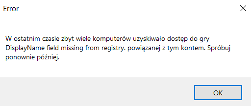 Kupiłem abonament EA Play, aby zagrać w Upadły Zakon. Zagrałem zaledwie dwa razy, a gdy przy trzeciej próbie uruchomienia chciałem zagrać wyskakuje za każdym razem komunikat "Error, W ostatnim czasie zbyt wiele komputerów uzyskiwało dostęp do gry DisplayName field missing from registry. powiązanej z tym kontem. Spróbuj ponownie później."