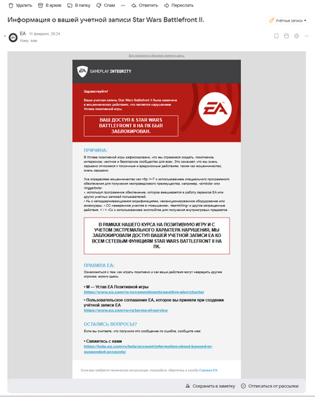Всем Здравствуйте 🤝 Ситуация следующая - 11 января мне на почту прилетает вот такое письмо 😱 я ничего не понял, так как я не играю в эту игру уже наверное лет 7, на одном аккаунте с BF6, ...