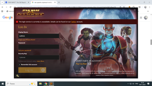 I have the same issue, after I fill my password and press login nothing happens, after few times of clicking login i get the service unavailable info. Reinstalling the game doesnt solve this issue. I've tried downloading a launcher through steam, but after I launch it there it says "An error has occured. Please exit and restart the SWTOR Launcher." If I login anyway the error msg changes to "Your Steam account is currently offline. Please quit the launcher, go online in Steam, and try again". Up till yesterday everything was working fine. It overall seems like an internet issue, but nothing has really changed since yesterday.