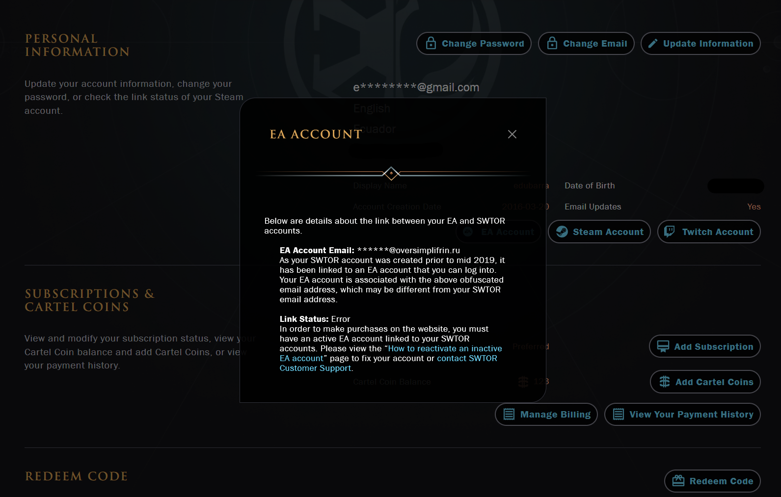 So, this time I wanted to buy some CC/subscribe, but before the payment an error message appear on the screen saying “there is an issue with your EA account”. Also saying that I can see my status on my SWTOR overview, I go there and turns out that there was another email ([edit: email address removed]) as my EA linked account.