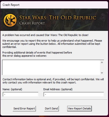 Fresh Windows 11, fresh Steam SWTOR, after I signed in, in the launcher, accepted the EULA, pressed play, I see the loading wallpaper for less than a second, and then the game closes with the crash r...