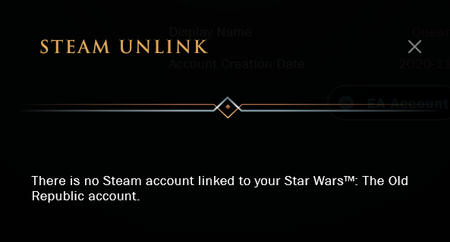 evv2ply35z58Rising Newcomer3 months agoMy Steam account isn't linked to my SWTOR account? This message shows up when I log in my account on the website. I've played the game on steam for like 2 years and have over 90 hours on it. I've only checked now because I've been thinking about ...Show More