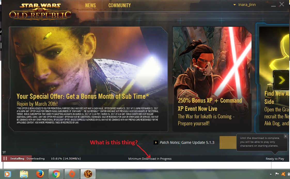 Husband installed ethernet cable on laptop. I uninstalled then reinstalled stwor. I launch and see this screencap. Apparently I have MORE to download but where, how and why? What is going on here? Why can't I play my sith Setira?