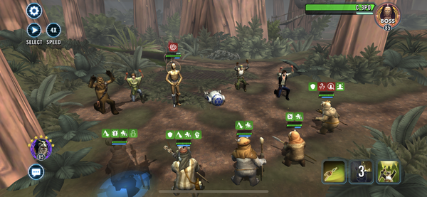 Always use wicket's stealth on elder. Don't use elder's specials unless someone is dead or elder is in the red. Keep as much fire as you can on paploo. Don't use elder's heal unless multiple ewoks are dead or the guaranteed revive is on cooldown. When paploo's abilities are on cooldown, use his basic to clear buffs. DAZE CHEWIE. Take them out in this order: Chewie, han, soldier, R2, leia, 3PO.