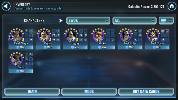 Speeds with mods were 200ish - 220ish- didn't move any mods at all, what I have for TW. - Beat 7* after ~10 tries with G11 zChirpa (l), G12 Elder, G10 Wicket+Logray+Paploo - full Omegas but only Zeta on Chirpas Lead. Most failed attempts either Elder got dead or Chewie was stealthed after Commando died so they burned through my bears. Speed Sets on all but less than +100.