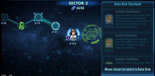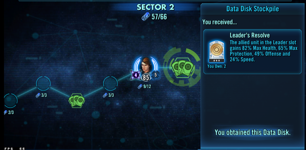 One Data Disk selection were all Power, 2 Green, 1 White.. Not much of a choice... But got 2 Ruthless Deliberation and a Blue Caustic Emission that help quite a bit. The "Ruthless" Data Disks are very useful for only being 1*.. - 9/12 - 2x leaders resolve, 1x offensive buffs, 1x ruthless swiftness