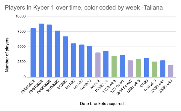 - Raw player numbers in kyber1 over time. As the months went on we started collecting information every week rather than just once a month to see the shape. You can see that players do move back into kyber1 through banner drift, but not enough to make up for the squish each month. This demonstrates that the squish formula is flawed for this division.