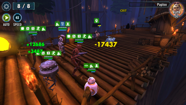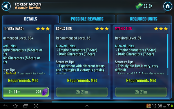 I've cleared tier 1 and 2. Using the event special that heals is key. Ended up using it for TFP and Tarkin during both runs on tier 1 and 2. Omega'd TFP's AoE and made sure that he targeted the elder whenever he used it so that the elder was ability blocked. Try and save up Tarkins Ultimate Firepower for the stages with full health Ewoks, it'll kill all of them if you've left it a stage or two. - Autobattled with ease Running HK, 88, bb, R2, K2.