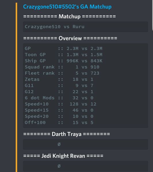 They use the DSR bot in Discord to have the data compiled like this. It works for guild matchups in TW too. Great stuff..."Globuhl;c-1758955" wrote: