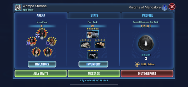 Coincidentally my opponent happens to have 23 gear 1 level 1 characters and a whole bunch of lower level\gear characters which puts us around even GP. When TB first became a thing as a 2015 starter player I went all in (as advised to do so by devs and game changers) to level and gear all of my roster to help my guild and community thrive in Hoth TB so I have every character unlocked 7 starred and gear 8 minimum.