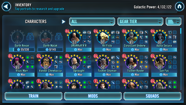 I hate the GA with a passion. I am being punished because of a high GP because I have worked on gearing and 7* ing all my toons. I always struggle in the GA, but this 3rd round matchup is completely ridiculous. My opponent has 85 G12 toons vs. my 37. He has enough to have full G12 defensive and offensive squads, and have a couple of extra G12 squads in case he struggles taking down any of my squads. Here are my lowest geared toons, which also includes my only 3 toons that are not level 85, my Tusken Raiders: