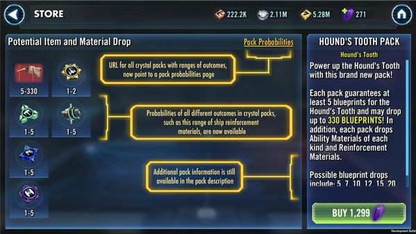 • We’ve taken this opportunity to improve the way a few of our packs work. As the game has evolved, we’ve found that some of the previous designs needed an overhaul. As an example, we’re doing away with the “new” and “old” character/ship distinctions, because that’s become a bit outdated and becomes excessively complicated with the more items we have in the game. The probability of getting any one character/ship within a pack will be equal across all characters/ships in a pack (unless otherwise noted). This will mainly be noticeable in Fleet Packs.